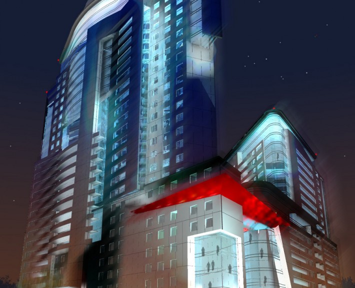 W projektowanym budynku przewidziano parkingi w trzech kondygnacjach (ok. 25 260 m2), usługi – 2 pierwsze kondygnacje nadziemne oraz częściowo w górnych kondygnacjach budynku (2 470m2), biura w części budynku na siedmiu kondygnacjach (2 380 m2), mieszkania stanowiące główna funkcję budynku znajdują się na 28 kondygnacjach powyżej poziomu garaży (66 710m2), zieleń – w atrium i na licznych tarasach budynku (950m2)